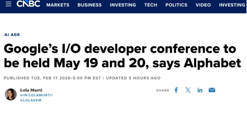 2月18日消息,据CNBC报道称,Alphabet 旗下谷歌公司正式宣布,其年度旗舰开发者大会 Google I/O 将于2026年5月19日至20日在加州山景城总部举行,活动将同步通过官网向全球观众直播。