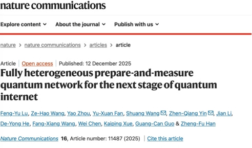 1月6日消息,据国际学术期刊《自然・通讯》显示,中国科学技术大学郭光灿院士团队的韩正甫、陈巍教授等与学校薛开平教授等合作,在构建异构量子网络方面取得进展,创新性地提出并实验演示了一种全异构量子网络架构及其关键支撑技术,并基于该架构实现不同物理维度的量子系统之间的开放式互联网络,同时能支持多种不同量子任务并行与自动优化,为迈向开放、多样化的量子互联网蓝图奠定关键技术基础。